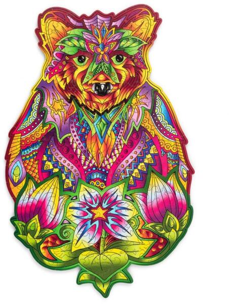 Remek ajándékötlet lesz egy gyönyörű színű, fából készült puzzle egy medve formában. A rejtvények 184 darabból állnak, amelyek egy része más állatok alakja.