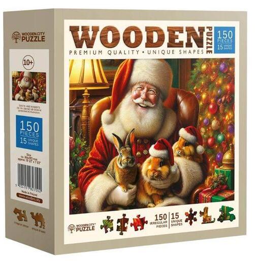 A 150 db-os kirakók 15 db egyedi formájú darabkát tartalmaznak az extra puzzle élményért. A Mikulás három aranyos kis nyuszit ölel a karácsonyfa előtt. A Wooden City 150 db-os fa puzzle - Mikulás nyuszikkal (NB0604-M) képe igazi ünnepi hangulatot áraszt.
