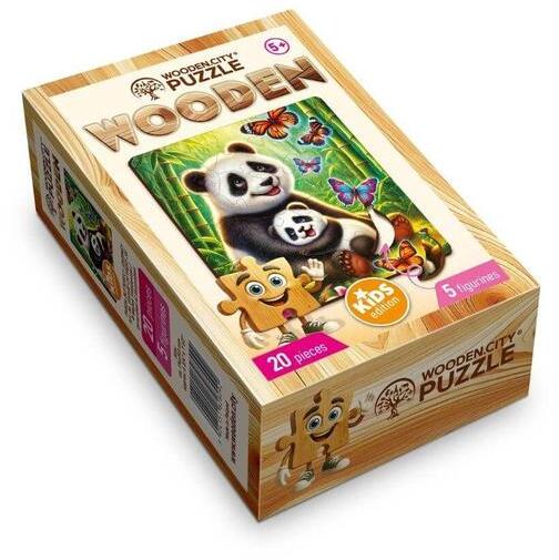 Pillangók és játékos pandák jelennek meg a kirakás után a Wooden City 20 db-os fa puzzle - Pandák és pillangók (CH99057-SV) képén. A 20 db-os kirakó a legkisebbeknek készült és 5 db egyedi formájú darabkát tartalmaz az extra puzzle élményért.