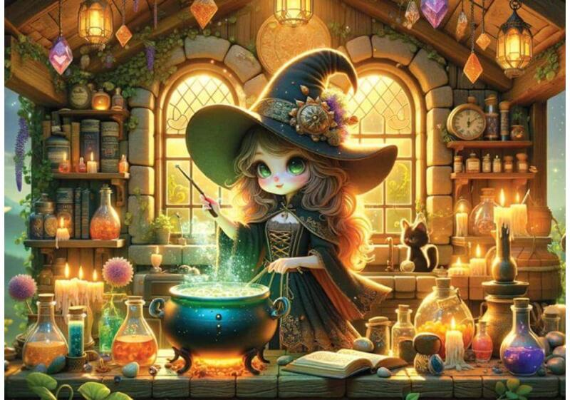 Egy kedves, barátságos boszorkány mosolyog mágikus kellékei között. A Yazz 4000 - Lovely Witch - 1000 db-os puzzle hangulata bájos, mesés és nem félelmetes.