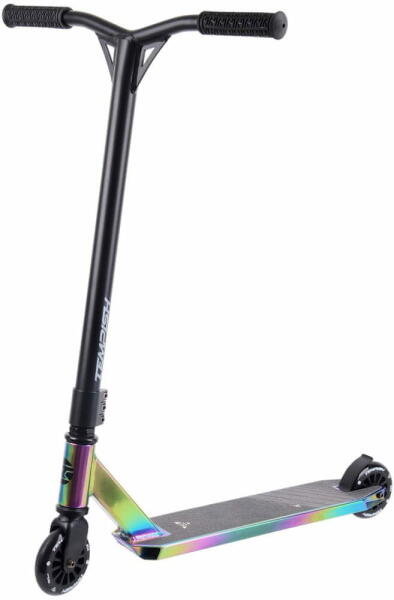 Utazz a szivárvány színeiben a VENTUS RAINBOW freestyle gyerek rollerrel, amely 85A keménységű 100 mm-es kerekekkel van felszerelve! A roller strapabíró acél villával, kétprofilú vázzal és kiváló minőségű alumíniumötvözetből készült megerősített kormánnyal rendelkezik, melyeket 120 mm-es TPR markolat egészít ki. A roller 3csavaros hüvellyel ellátott menetes kompressziós rendszert is tartalmaz.