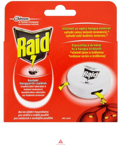 A Raid® Kontakt hangyairtó csalétek eltűnteti az egész kolóniát. A ház bármely pontján használható.
