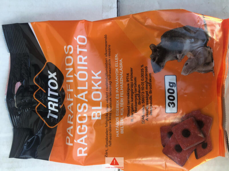 Paraffinos rágcsálóirtó blokk, egerek, patkányok és egyéb kártevő rágcsálók elleni védekezésre. Brodifakum hatóanyag, bitrex védelem, időjárás álló, lakossági felhasználásra.