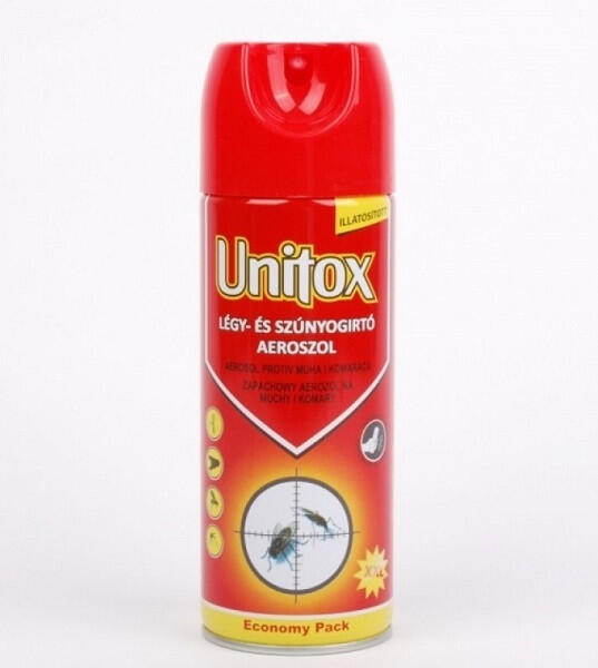 Unitox légy- és szúnyogirtó ae. 200 mlHatóanyag:Tetramethrin 0,2%, Permethrin 0,15 %, Piperonyl Butoxide 1%Felhasználás:Zárt térben, légtérkezelésre25-30 m3-es helyiségben, 5 másodpercig permetezveLeírásRepülőrovarok irtására alkalmazható!Használat előtt alaposan felrázandó! Alkalmazás előtt zárja be az ajtókat és ablakokat, a porlasztást a szoba közepén állva kezdje, majd hátrálva haladjon az ajtó felé. A szer 60 perc alatt fejti ki hatását, utána laposan ki kell szellőztetni!Ez a termékleírás tájékoztató jellegű, a készítmény felhasználása előtt olvassa el a címkéken található használati utasítást!
