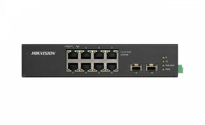 Hikvision DS-3T0510HP-E/HS 10 portos ipari Gbit PoE switch (110 W), 6 PoE+ / 2 HiPoE / 2 SFP uplink port, nem menedzselhető