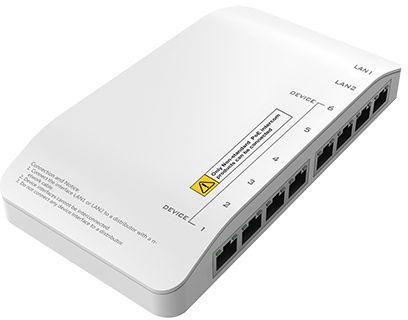 Disztribútor egység kaputáblákhoz és lakáskészülékekhez; beépített feszültség stabilizátor; 8x100Mbp