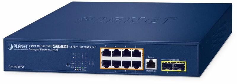 PLANET (GS-4210-8UP2S) PLANET IPv6/IPv4, 8-Port Vezérelt L2/L4 Gigabit Ethernet (10/100/1000) Ethernet-áramellátás (PoE) támogatása 1U Kék