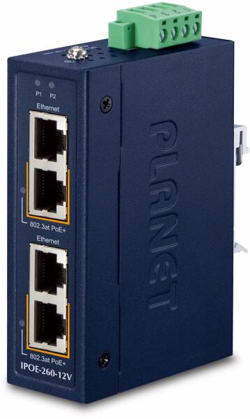 PLANET Industrial 2-port 10/100/1000T Gigabit Ethernet (10/100/1000) Ethernet-áramellátás (PoE) támogatása Kék (IPOE-260-12V) (IPOE-260-12V)