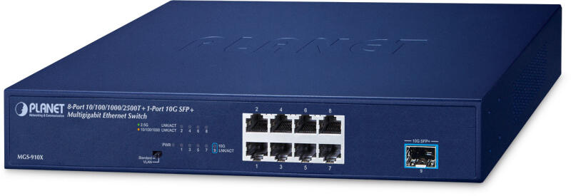 PLANET (MGS-910X) Planet MGS-910X 8-Port 10/100/1000/2500T + 1-Port 10G SFP+ Multigigabit Ethernet Switch (Fanless design, Standard/VLAN mode, desktop size with rackmount kit)