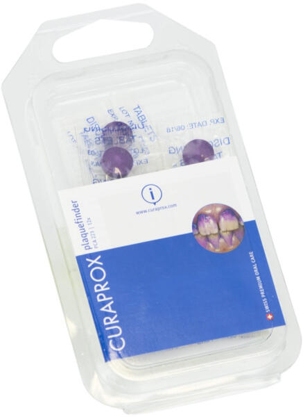 CURAPROX plakkfestő tabletta Megmutatja elszínezésssel, hol szükséges még a fogmosás, fogtisztítás.