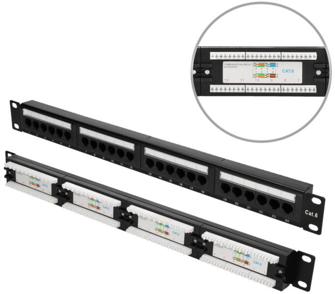 Patchpanel Extralink 24 ports cat. 6 UTP 1U The patchpanel is one of the basic elements used for structural cabling. It is installed in 19" racks. The screws used for assembly are the same as for active devices. The task of the patchpanel is to terminate the cables coming down to the distribution cabinet. The RJ45 cat 6 UTP patchpanel ports connect to the active device using patchcords of appropriate category to maintain the appropriate connection standard. The cable is connected to the patchpanel using a punch down tool.
