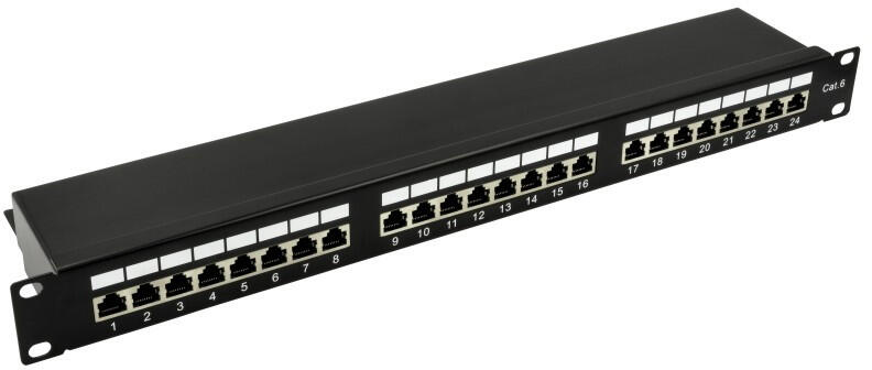 19" patch panel; 24 port; Cat6; árnyékolt; tehermentesítővel; dual IDC (Krone/110)