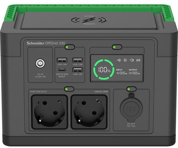 APC Schneider OFFGRID 330 hordozható akkumulátor állomás, 332Wh Lítium-ion, 2xSCHUKO, 3xUSB, 2x USB-C, Színuszos, LCD (PPS330-GR) (PPS330-GR)