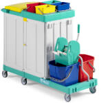 Többcélú takarítókocsi két 15 literes vödörrel és füllel. Két 27 x 44 cm polc és két 12 literes vödör a mosószerek tárolására. Tartó a 120 literes szemeteszsák tárolására. A polipropilén...