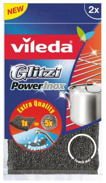 Tulajdonságok:A Vileda Glitzi Power Inox prémium súrolópárna rozsdamentes acélhurkai kíméletlenek az odaégett ételmaradékokkal. Fáradtság nélkül, csupán kis erőkifejtéssel könnyedén tisztaságot varázsolhat egy grillezés után is! A párna belsejében szivacs található, így a kíméletlen tisztítás mellett a kézre is tekintettel van, valamint a kiöblíthetőség, a párna tisztán tartása is könnyebben elvégezhető. 5x tartósabb, mint a hagyományos fém súrolók.  Makacs szennyeződések egyszerű eltávolításáhozKiváló minőségű rozsdamentes inox anyagbólKülönlegessége, hogy 5-ször tovább tart, mint a normál inox súrolókKiszerelés: 2 db/csomag