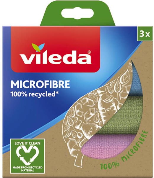 VILEDA ÚJRAHASZNOSÍTOTT SZÁLAS MIKROKEFE3 darab a csomagban Újrahasznosításból készültA ruha 100%-ban újrahasznosított PET-palackokból készült anyagból készül. Hatékony tisztításEltávolítja a makacs és zsíros szennyeződéseket. Nem hagy csíkokat vagy cseppeket. Univerzális használatMinden felületre alkalmas. Tisztítószer nélkül használható. Összetevők100% poliészter. Praktikus csomagolásA csomagban három különböző színű kendőt talál. Könnyű karbantartásA kendők max. 60°C-on moshatóak a mosógépben. Az avivage nem ajánlott. JellemzőkÚjrahasznosított anyagKiváló tisztítási teljesítményNagy nedvszívó képességMéretek és súlyA csomag méretei: 150 x 35 x 176 mm. Súly: 110 g.