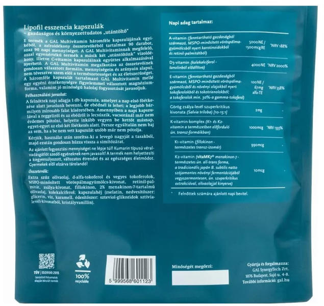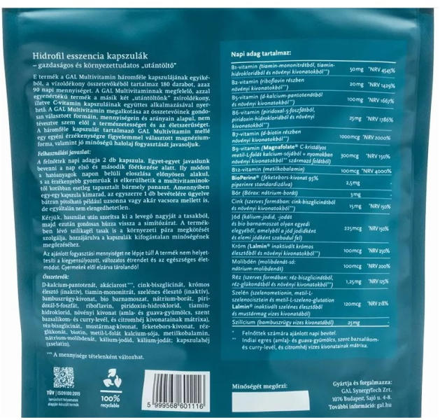 A GAL Multivitamin termék minden vitamint, ásványi anyagot, nyomelemet ideális formában, mennyiségben és arányban tartalmaz, nem eltérve attól, ahogyan ezekhez állandó tápanyagdús, változatos táplálkozással juthatnánk. Ezen hatóanyagok mindegyike természetben megtalálható forma, jelentős részük organikus termesztésből származó (bio) gyógy- és fűszernövényekből van kivonva, így azon ko-faktorokból is tartalmaz, amelyek e növényekben aligha véletlenül vannak jelen a bennük lévő vitaminok/ásványok mellett.