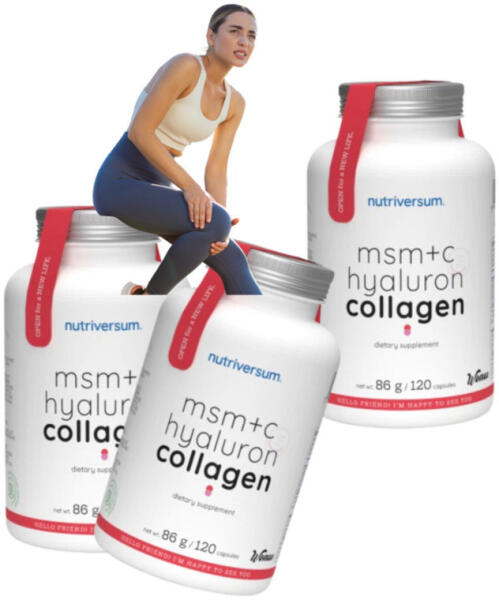 Nutriversum MSM+C Hyaluron Collagen 120 kapszula A kollagén évtizedek óta népszerű összetevő szépségipari termékekben, hiszen számos pozitív tulajdonsága ismert, amik révén közkedveltté vált.