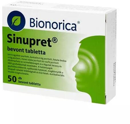BETEGTÁJÉKOZTATÓ: INFORMÁCIÓK A FELHASZNÁLÓ SZÁMÁRASinupret bevont tablettatárnicsgyökér porított, kankalinvirág porított, fekete bodza virág porított, mezei sóska porított és vasfű porított Olvassa el figyelmesen az alábbi betegtájékoztatót, mely az Ön számára fontos információkat tartalmaz. Ez a gyógyszer orvosi rendelvény nélkül kapható. Mindamellett az optimális hatás érdekében elengedhetetlen e gyógyszer körültekintő alkalmazása. Tartsa meg a betegtájékoztatót, mert a benne szereplő információkra a későbbiekben is szüksége lehet. További információkért vagy tanácsért forduljon gyógyszerészéhez. Sürgősen forduljon orvosához, ha tünetei 7-14 napos gyógyszerszedést követően nem enyhülnek vagy éppen súlyosbodnak. Ha bármely mellékhatás súlyossá válik vagy ha a betegtájékoztatóban felsorolt mellékhatásokon kívül egyéb tünetet észlel, kérjük, értesítse orvosát vagy gyógyszerészét. A betegtájékoztató tartalma: Milyen típusú gyógyszer a Sinupret bevont tabletta és milyen betegségek esetén alkalmazható? Tudnivalók a Sinupret bevont tabletta szedése előtt Hogyan kell alkalmazni a Sinupret bevont tablettát? Lehetséges mellékhatások Hogyan kell a Sinupret bevont tablettát tárolni? További információk 1. Milyen típusó gyógyszer a Sinupret bevont tabletta és milyen betegségek esetén alkalmazható?Alkalmazható az orrmelléküregek és a légutak heveny és idült gyulladásainak kezelésére. A hatóanyagok gyulladáscsökkentő, nyálkaoldó hatásúak, megkönnyítik a letapadt váladék felköhögését és kiürítését. Antibakteriális kezelés kiegészítésére. A Sinupret bevont tabletta szénhidráttartalma nem számottevő.  2. Tudnivalók a Sinupret bevont tabletta szedése előttNe szedje a Sinupret bevont tablettát:ha allergiás (túlérzékeny) a hatóanyagra vagy a Sinupret bármely egyéb összetevőjére. A Sinupret bevont tabletta fokozott óvatossággal alkalmazható1 tabletta 41,6% emészthető szénhidrátot és 0,1% szorbitot tartalmaz. 1 tabletta szénhidráttartalma 0,01 kenyéregység. A Sinupret bevont tabletta szénhidráttartalma nem számottevő. A kezelés ideje alatt szedett egyéb gyógyszerekFeltétlenül tájékoztassa kezelőorvosát vagy gyógyszerészét a jelenleg vagy nemrégiben szedett egyéb gyógyszereiről, beleértve a vény nélkül kapható készítményeket is. A Sinupret bevont tabletta egyidejű alkalmazása bizonyos ételekkel vagy italokkalA készítmény hatását az étel-ital minősége / mennyisége nem befolyásolja. Terhesség és szoptatásMint minden gyógyszer, terhesség és szoptatás alatt a Sinupret bevont tabletta is csak a kezelőorvos javaslatára, az előny-kockázat szigorú mérlegelését követően szedhető. A készítmény hatásai a gépjárművezetéshez és gépek kezeléséhez szükséges képességekreA készítmény nem befolyásolja a gépjárművezetéshez és gépek kezeléséhez szükséges képességeket. Fontos információk a Sinupret bevont tabletta egyes összetevőirőlA Sinupret bevont tablettát a ritkán előforduló örökletes fruktóz- vagy galaktóz-intoleranciában, laktáz-hiányban vagy glükóz-galaktóz felszívódási zavarban vagy szukráz-izomaltáz elégtelenségben szenvedő betegek nem szedhetik.  3. Hogyan kell alkalmazni a Sinupret bevont tablettát?Az utasítást pontosan be kell tartani, mert egyébként a gyógyszer nem tudja a hatását megfelelőképpen kifejteni. Szokásos adagja: felnőtteknek naponta 3x2 tabletta, iskoláskorúaknak naponta 3x1 bevont tabletta. A bevont tablettát szétrágás nélkül, kevés folyadékkal kell bevenni. A készítményt a panaszok megszűnéséig kell használni. A készítmény tartós, 7-14 napos kezelésre is használható. Amennyiben a panaszok ezt követően is fennállnak, orvoshoz kell fordulni. Ha az előírtnál nagyobb adagot vett be:Mérgezések a Sinupret bevont tablettával jelenleg nem ismertek. Túladagolás esetén a nemkívánatos hatások gyakoribbak. Ha elfelejtette bevenni a Sinupret bevont tablettát:Ne vegyen be kétszeres adagot a kihagyott adag pótlására. Ha bármilyen további kérdése van a készítmény alkalmazásával kapcsolatban, kérdezze meg orvosát vagy gyógyszerészét.  4. Lehetséges mellékhatásokMint minden gyógyszer, a Sinupret bevont tabletta is okozhat mellékhatásokat, amelyek azonban nem mindenkinél jelentkeznek. Nagyon ritka mellékhatások (10 000 betegből kevesebb, mint egynél):gyomorfájás, hányinger, túlérzékenységi reakció (pl. bőrkiütés, bőrpír, viszketés, érduzzanat, nehézlégzés, arcödéma). Ilyen esetekben a Sinupret bevont tabletta szedését meg kell szakítani és orvoshoz kell fordulni. Ha bármely mellékhatás súlyossá válik, vagy ha a betegtájékoztatóban felsorolt mellékhatásokon kívül egyéb tünetet észlel, kérjük, értesítse orvosát vagy gyógyszerészét.  5. Hogyan kell a Sinupret bevont tablettát tárolni?Legfeljebb 30°C-on tárolandó. A gyógyszer gyermekektől elzárva tartandó!A dobozon feltüntetett lejárati idő után ne alkalmazza a Sinupret bevont tablettát. A lejárati idő a megadott hónap utolsó napjára vonatkozik. A gyógyszereket nem szabad a szennyvízzel vagy a háztartási hulladékkal együtt megsemmisíteni. Kérdezze meg gyógyszerészét, hogy szükségtelenné vált gyógyszereit miként semmisítse meg. Ezek az intézkedések elősegítik a környezet védelmét.  6. További információkMit tartalmaz a Sinupret bevont tabletta?Hatóanyag bevont tablettánként: 6 mg tárnicsgyökér porított (Gentiana lutea L. , radix), 18 mg kankalinvirág porított (Primula veris L. , at Primula elatior (L. ) Hill. , flos), 18 mg fekete bodza virág porított (Sambucus nigra L. , flos), 18 mg mezei sóska porított (Rumex L. , herba) és 18 mg vasfű porított (Verbena officinali