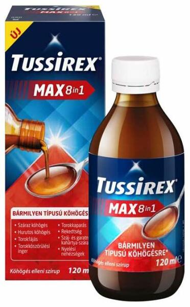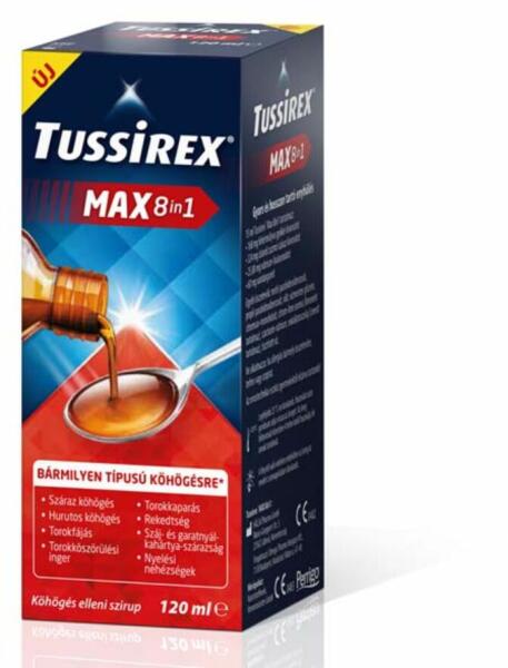 A Tussirex MAX 8in1 szirup hatékonyan csillapítja a száraz és hurutos köhögést, enyhíti a torokfájást, rekedtséget, valamint a torokköszörülési ingert és torokkaparást. Emellett segít a száj- és garatnyálkahártya szárazságának megszüntetésében, és megkönnyíti a nyelést is.