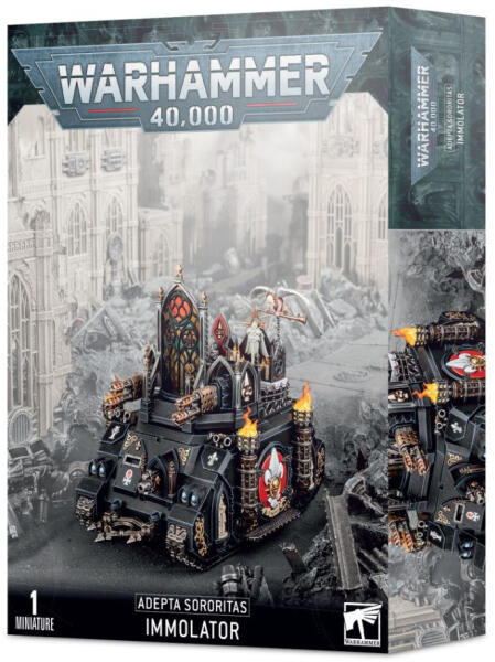 Used exclusively by the Adeptus Ministorum, the Immolator-pattern armoured assault transport is a variant on the Rhino chassis. Atop the hull of each Immolator is mounted an elaborate turret arrangement that incorporates a stained-armaglass ballistic shield, auto-choral targeting array and gunner's nest linked to a twinned pair of devastating heavy weapons. The Immolator is equipped with a hull-mounted heavy bolter and can be assembled with a choice of three main armaments on its turret – Immolation flamers, twin heavy bolters or twin multi-meltas. It can also equipped with an optional hunter-killer missile. This set is supplied in 105 plastic components. An Adepta Sororitas Transfer Sheet is also included.