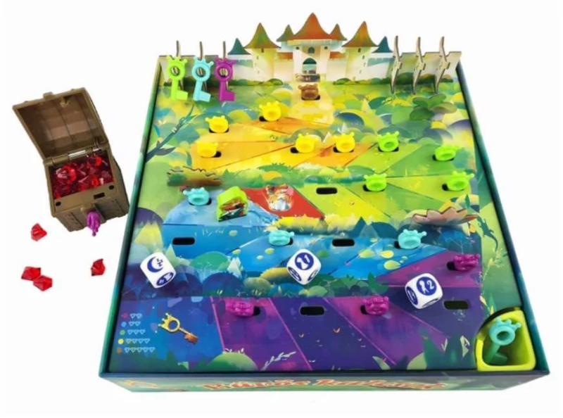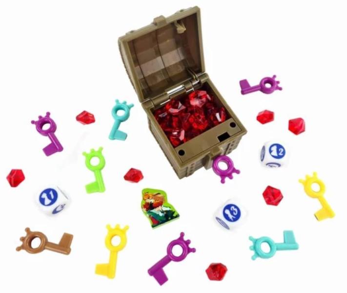 - ha nem nyílik a láda, akkor tartsd meg a kulcsot, tedd magad elé, hogy mindenki láthassa, hogy egy rossz kulcs már kikerült a játékból az adott színben.  Amikor szereztél kristályt, akkor a bábut vissza kell tenni a start mezőre és egy másik játékos következik. Amikor olyan helyzet alakul ki, hogy valamelyik játékos megáll kincs megszerzése nélkül, mert mindhárom kockával holdat dob, akkor a következő játékos onnan folytatja a játékot. Az egy darab arany kulcs a legutolsó mezőn biztosan nyitja a zárat, de odáig kockázatos az út. A speciális mezőkre érkezve a játékos újra dobhat mindhárom kockájával, így érdemes a lépéseket úgy felhasználni, hogy ebből a jutalomból ne maradjunk ki. A játék akkor ér véget, amikor egy játékos összegyűjti a szükséges számú drágakövet. Egyszerű és gyönyörű családi kincsszerzős társasjáték 6 éves kortól, melyben a bátorság legalább olyan fontos, mint a jó szerencse. A társasjáték tartalma: