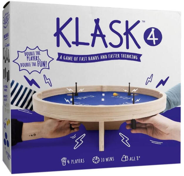 Ha azt hitted, a legügyességibb társasjáték élményét nem lehet fokozni, akkor kapaszkodj meg jól: itt a 4 személyes változat! Cselezz, célozz és lőj gólt - úgy, hogy most már egyszerre három ellenfélre kell figyelned! Tedd próbára magad és barátaid, és légy TE a Klask-bajnok! A Klask egy egyszerű, de nagyszerű ötletre épült: a léghoki és a csocsó legjobb elemeit ötvöző játék hamar meghódította az egész világot, és népes rajongótábora a legextrémebb helyeken és legextrémebb fogadásokat megkötve játszik. Az izgalmak most fokozódnak: ha nem lenne elég nagy kihívás a párbaj, most már akár négyen is nekiülhettek a játéknak! Nem hallottál még a Klask-ról?