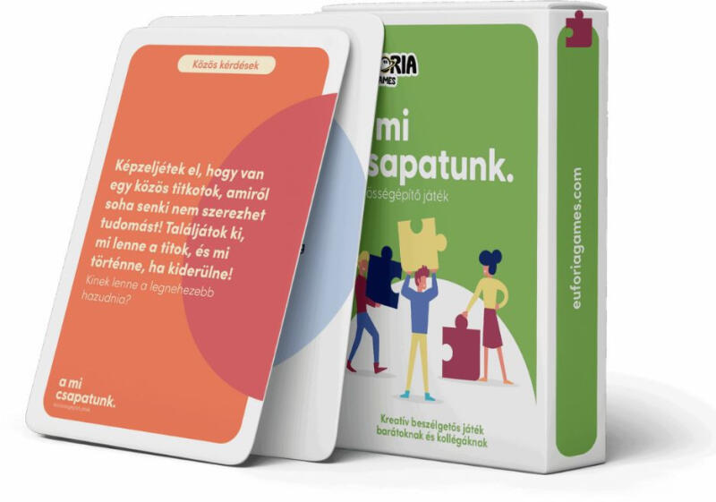 Ismerd meg a csapatod játékosan az Eufória – a mi csapatunk kártyajátékkal! Ez a közösségépítő játék szórakoztató kérdésekkel és kihívásokkal segíti a személyes kapcsolatok elmélyítését. Iskolai, munkahelyi vagy baráti közösségek számára is ideális, hiszen gyorsan közelebb hozza az embereket egymáshoz, miközben a nevetés sem marad el. Fejleszd a csapatod kommunikációját és bizalmát egyszerűen, de hatékonyan!