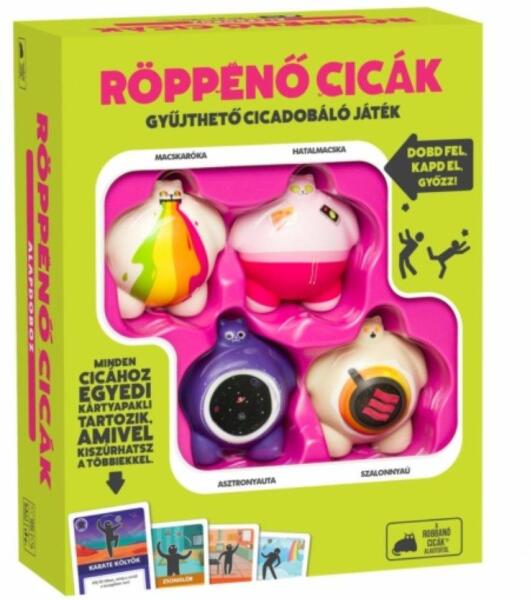 Mit kell tudni a játékról? Röppenő cicák társasjáték - Gyűjthető cicadobáló játék Könnyed, vicces ügyességi parti társasjáték 8 éves kortól a Robbanó cicák alkotóitól, melyben a játékosok célja, hogy minél több trükköt teljesítsenek a cicáikkal.  Az ügyességi játékok kedvelői színes cicákat fognak dobálni, így minden mozdulat egy kis ügyességet és szerencsét is igényel. A szabályok rendkívül egyszerűek, így már 6 éves kortól játszható, akár az egész családdal.  A játék 2-4 fő részére ajánlott, de akár többen is élvezhetik a vicces dobálgatást, ha csapatokat alkotnak, vagy több készletet is beszereznek. A cicák feldobása és a mutatvány végrehajtása látványos, mókás és mindig nevetés a vége. A játék során mindenkinek lesz egy saját cicája, a cicákhoz pedig mutatványkártyák tartoznak, amiket végre kell hajtani, amíg a cica a levegőben van. Ha valaki teljesít 5 mutatványt egy dobás alatt megnyeri a játékot. Egy-egy forduló gyors, így a játék pörgős, nem ül le a hangulat. A dobálgatás és a finom mozdulatok fejlesztik a kézügyességet és a szem-kéz koordinációt.  A játék remekül leköti a gyerekeket, de a felnőttek is gyorsan belefeledkezhetnek a versenybe.  A cicák anyaga puha, biztonságos, így kisebb gyerekek kezébe is bátran adható. A Röppenő cicák ideális választás születésnapi zsúrokra, családi estékhez vagy baráti összejövetelekhez.  Nagy előnye, hogy rövid idő alatt is élvezetes élményt nyújt. A humoros karakterek és a cicák aranyos kinézete miatt gyorsan a gyerekek kedvencévé válik. A játékmenet kiszámíthatatlan és izgalmas, így újrajátszhatósága rendkívül magas.  Más pakkokkal kombinálva többen is lehet játszani, ráadásul akár mind a 12 puha cicát is össze lehet gyűjteni. Tartalma: