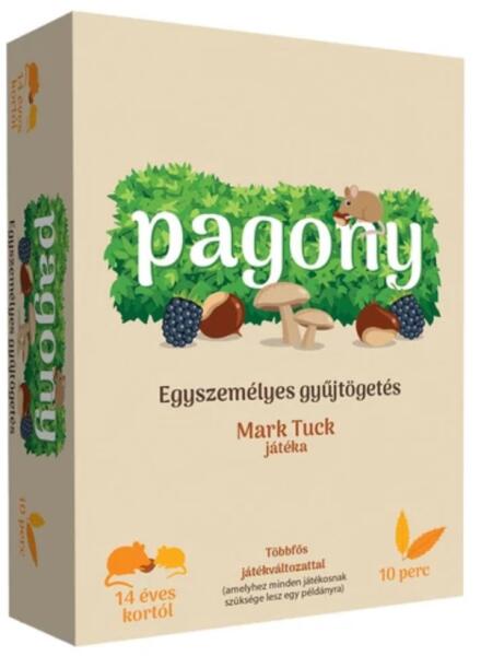 Mit kell tudni a játékról? Pagony egyszemélyes gyűjtögetés  Gyorsan lejátszható kimondottan egyszemélyes kártyajáték 14 éves kortól, melyben a játékos célja minél több élelmiszer összegyűjtése a különböző erdőterületek kijátszásával. A játékkal fejleszthető a logikus gondolkodás is, emellett többen is lehet játszani egyszerre, ha a játékosok mindegyikének van saját Pagony kártyája. A játék szabályai viszonyleg egyszerűek, azonban a minél több pont elérése elgondolkodtathatja a játékost. A játékos mindössze 9 kártyát használ, de a feladat annál izgalmasabb. A játék kártyáin szederrel, gesztenyével és gombával ábrázolt erdőterületek találhatók. A játékos célja pedig, hogy ezeknek a kártyáknak az egymásra rakásával és a megfelelő élelmek begyűjtésével minél több pontot érjen el a játék végén. A játékos köre 3 fázisból áll: kártya kijátszása, kockák lehelyezése és új lap húzása. A kártyákat lehet forgatni, de az újonnan lerakott kártyának legalább egy területet le kell fednie egy területet az erdőben.  Figyelni kell azonban a felbukkanó egerekre is, hiszen ők is élelmet keresnek. Valamint a játék tartalmaz különleges recepteket is, melyekkel nehezíthető a játék. A játékot Mark Tuck tervezte, akinek a neve ismerős lehet, hiszen a szintén egyszemélyes Liget kártyajátékot is ő tervezte. Tartalma: