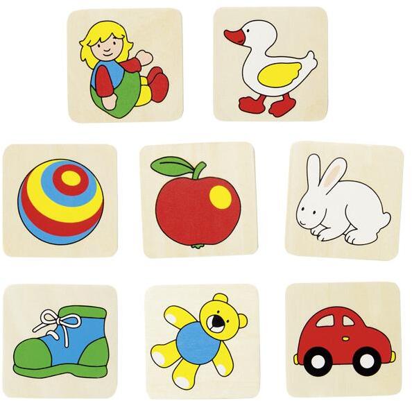 Erős, préselt fa lapokból készített, színes memória játék készlet 16 darab egyszerű, könnyen megnevezhető ábrákkal, 8 párral. A fa lapok nagy méretűek, kisgyermek kézzel könnyen felemelhetőek, forgathatóak. A játék kiterítve látványos, esztétikus, foglalkozásra csábító. A memórialapok fa dobozban vannak. Ki találja meg a legtöbb párt? A legkisebbek memóriája fejleszthető a játékkal.