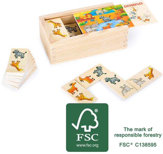 A varázslatos szafarik világába csöppenhetünk e játék segítségével. A dominó lapjain különböző kedves vadállatok vannak: zsiráf, majom, elefánt, zebra, orrszarvú és antilop. A bájos kivitelezésnek köszönhetően a 3 évesnél fiatalabbak is megtanulhatják általa a dominó egyszerű szabályait. Az egyforma figurákat egymás mellé kell helyezniük, míg a dominó el nem fogy.  Közben nem csak remekül szórakozhat a gyermek, hanem készségeit is fejleszti. A rakosgatás, pakolgatás a finommotorikus készségek erősítésére jó. A színek, formák felismerése örömmel tölti el a gyerekeket, és közben a logikájuk, koncentrálóképességük is fejlődik. A szafaris dominójáték 28 dominólapot tartalmaz, melyek erős, minőségi fából készültek. Szállításuk, tárolásuk céljából egy fadobozt is tartalmaz a készlet, így utazáskor, nyaraláskor is magunkkal vihetjük a vadállatos dominót. A termék FSC 100%-os minősített fából készült, erről tanúsítvánnyal rendelkezik, a gyártás során magas fokú környezetvédelmi szemléletet követnek, ezáltal magas a társadalmi felelősségvállalás.