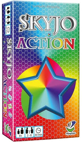 Mit kell tudni a játékról? Skyjo Action - Skyjo kártyajáték új változata A Skyjo Action különlegessége, hogy itt már akció kártyákat is felhúzhatunk és kijátszhatunk, ami sokkal taktikusabbá és élvezhetőbbé teszi ezt a remek játékot. Mivel garantáltan sokszor fog a kezetekbe kerülni a világ egyik legjobb kártyajátéka, ezért érdemes az eredeti, Magilano által kiadott paklit használni. Ezek a lapok sokkal tartósabbak, strapabíróbbak, mint a koppintott kínai változat. Hamar megtanulható kártyajáték, mely könnyen a család kedvencévé válik. Kisebbeknek (akár 8 éves kortól) a számolás (összeadás, kivonás) gyakorlásához, nagyobbaknak családi vagy party kártyajátékként kiváló választás. A játék célja: Cserélgesd ügyesen a kártyáidat, hogy a végén neked legyenek a legalacsonyabb pontszámú kártyáid! A játék addig tart, míg az egyik játékos eléri a 100 vagy annál több pontot. A játékot az nyeri, aki a legkevesebb pontot gyűjtötte. Ebből következően az a célunk, hogy a sok pontot érő kártyáinktól mihamarabb megszabaduljunk. A játék előkészületei: Szedjé tek ki a pakliból az akciókártyákat (rózsaszín hátterű lapok 30 db összesen). A nagyobb főpakli csak számokat és csillagokat ábrázoló kártyákból áll. Mindkét paklit keverjétek meg külön-külön. Minden játékosnak az osztó 12 db kártyát oszt fejjel lefelé, hogy a többi játékos ne lássa. Ezután a maradék paklit elhelyezzük az asztal közepén, ahol mindenki könnyedén elérheti. Ez képezi majd a húzópaklit. Felcsapjuk a legfelső lapot és a húzópakli mellé rakjuk képpel felfelé, ez lesz majd a dobópakli. Minden játékos a kapott 12 db kártyáját kirakja három sorba és négy oszlopba maga elé. A kártyák még mindig lefelé vannak. Ezután megfordít mindenki kettő kártyát a saját 12 kártyájából. Bármelyik kettőt meg lehet fordítani. Az akciólapokból fordítsunk fel négy darab lapot, majd ezeket képpel felfelé helyezzük mindenki számára elérhető helyre és tegyük mellé a maradék akciólapokat húzópakliként. Emellett maradjon még egy kis hely az akciókártyák dobópaklijának. Akciókártyák: