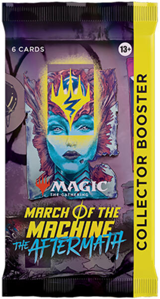Each March of the Machine: The Aftermath Collector Booster contains 6 Magic: The Gathering cards and 1 Traditional Foil double-sided token, with 4 cards of rarity Rare or higher and 2 Uncommon cards. Every pack contains a total of 5–6 foil cards