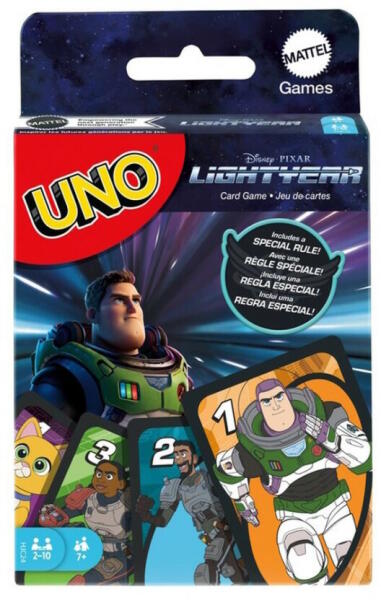A népszerű  UNO-kártyajáték Disney kiadása  Buzz LightYear segítségével most a végtelenbe és tovább repít! A játék célja, hogy a játékosok mindig a pakli tetején lévő kártyához passzoló lapot dobva elsőként szabaduljanak meg az összes kártyájuktól.  Ez a kiadás egy különleges szabállyal teszi még izgalmasabbá a megszokott Uno-élményt! A speciális, hipersebesség szabály miatt egyszerre több játékos is kimaradhat egymás után a körből! Szabadulj meg elsőként a lapoktól, és gyűjtsd a pontokat! Ha már csak egy lapod maradt, ne feledd el bemondani, hogy „UNO!