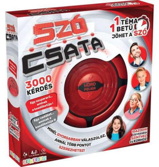 „Mondj egy szót, ami ezzel a betűvel kezdődik…! – szól a játékmester, majd azonnal elindul a 12 másodperces visszaszámlálás. Ki talál hamarabb jó választ? A Szó Csata egy pörgős, vidám családi kvízjáték, ahol a gyors és kreatív gondolkodás visz közelebb a győzelemhez. A játékosok izgatottan figyelnek, amikor a játékmester kimondja az új feladványt. A visszaszámláló elindul, és mindenki lázasan keresi a fejében a megfelelő szót, mielőtt az idő lejárna. A nevetések és a gyors reakciók teszik igazán élvezetessé ezt a pörgős szócsatát. Ebben a gyors, családi kvízjátékban a játékosoknak 12 másodpercük van arra, hogy a megadott betűvel kezdődő szót mondjanak az aktuális témában. A játék elektronikus mestere hangosan felolvassa a kérdést és számolja az időt , miközben a játékosok versenyeznek a leggyorsabb helyes válaszért. Ha valaki nem tud felelni, vagy a válaszát a többiek nem fogadják el, pont nélkül marad. A játék során a feladványok folyamatosan változnak, így minden parti új kihívásokat tartogat. Az nyer, aki a legtöbb pontot szerzi meg a körök végére. A játék nyelve: magyar. Doboz tartalma: