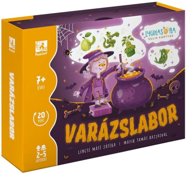 Mit kell tudni a játékról? Varázslabor Pagony társasjáték A Lyukasóra sorozat legújabb tagja egy vicces és pörgős kártyajáték, 7 éves kortól, melyet akár iskolában, a szünetekben is lehet játszani. A kártyajáték a megfigyelésen és a memórián alapul, a játék során különböző varázsösszetevők neveit kell mondogatni és minél több pontot gyűjteni. A játék menete egyszerű, de mivel gyorsasági és megfigyelős kártyajátékról van szó a figyelem egy pillanatra sem lankadhat. A kártyákat egyenlően szét kell oszlatni a játékosok között, így mindenkinek lesz egy saját paklija, melyből körönként mindig egyet-egyet felcsapnak. A kártyajáték legfontosabb része, hogy a játékosoknak mindig hangosan ki kell mondaniuk az éppen abban a körben felfordított kártyájukat. De nemcsak egyszer, hanem miközben minden játékos felfordítja a lapját a többiek mantrázzák a saját lapjukon szereplő elnevezéseket.  A játék így kicsit kaotikusnak tűnhet és hamar bele lehet zavarodni, de ez adja a humorfaktort. Ha valaki hibázik, az addig felfordított lapjai visszakerülnek a paklija aljára. Amint valakinek elfogynak a felfordítandó kártyái a játék véget ér. A kártyajátékot további akciókártyák és párbajhelyzetek teszik még izgalmasabbá. Valamint a játékszabály tartalmaz egy nehezített játékvariánst és egy kétfős játékváltozatot is. A játék fejlesztheti a gyermek megfigyelőkészségét, reflexeit, memóriáját, és a beszédkészségét is. Tartalma:
