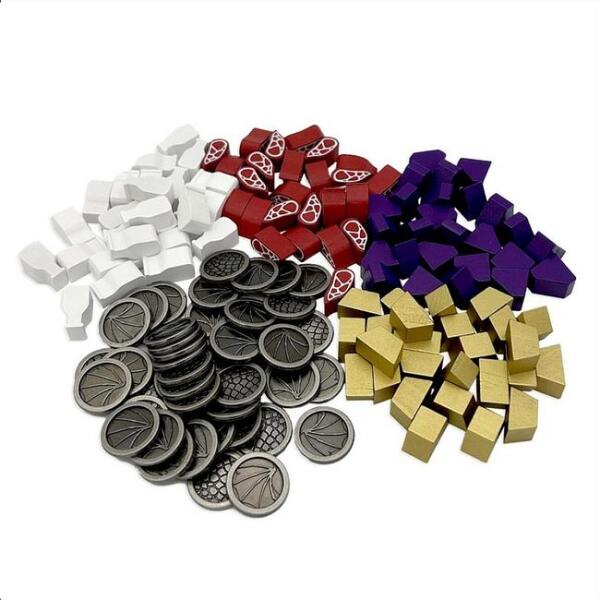 Wyrmspan Upgrade Pack Ezeket a 45 fémérmét és 100 fa erőforrás zsetont kifejezetten a Wyrmspan játékhoz tervezték (a játék karton zsetonokat tartalmaz). Az összes fémérme azonos, az erőforrás zsetonokból pedig 25-25 darab van: hús, drágakő, arany és tej.
