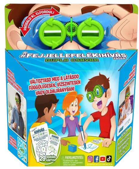 Merülj el a kreatív kihívások világában a Fejjel lefelé kihívás - Dupla csavar társasjátékkal!Ez az izgalmas társasjáték lehetőséget kínál, hogy próbára tedd ügyességedet és képzelőerődet, miközben a speciális szemüveget viselve teljesíted a különféle kihívásokat. A periszkóp elvén működő szemüveg által a feje tetejére áll a világ, így igazán vicces lesz még a legegyszerűbb mozdulat is. A játék előkészítése során a résztvevők összegyűjtik a szükséges eszközöket, majd az asztal köré gyűlnek, ahol az egyéni és csapatkihívás-kártyákat külön pakliba rendezik. Az izgalom fokozódik, amikor a játékosok felváltva húzzák a kártyákat a pakliból, és szembesülnek a különleges feladatokkal, amiket fejjel lefelé kell teljesíteniük. Az ügyességi és kreatív kihívások során a játékosoknak nemcsak fizikai, hanem szellemi képességeiket is próbára kell tenniük. Az egyes kihívások teljesítéséért pontok járnak, amelyek attól függnek, hogy milyen látásmódra van beállítva a szemüveg.  A nehezebb beállítások több pontot érnek, így a nagyobb kockázat nagyobb jutalmat hozhat. A játék végén az összes kihívás teljesítése után az a játékos nyer, akinek a legtöbb pontja van. Döntetlen esetén egy különleges, hirtelen halál jellegű kihívás dönti el, ki a győztes. A játék újra és újra játszható, mivel a kihíváskártyák a játék végén letörölhetők, így végtelen szórakozást biztosít az egész család számára.  A termék jellemzői:Speciális szemüveg a kihívásokhozFizikai és szellemi kihívásokPontgyűjtés különböző nehézségi szintekenÚjrahasznosítható kihíváskártyákCsapat- és egyéni feladatokCsomagolás mérete: 5.8 x 22 x 26.5 cm