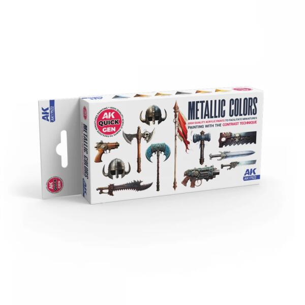 Az Ak Interactive Quick Gen festékek különlegessége, hogy gyorsan festhetőek velük a figurák, nincs szükség alapozásra, több rétegre. Speciális festék készlet ami a fémes tárgyak, fegyverek festés...