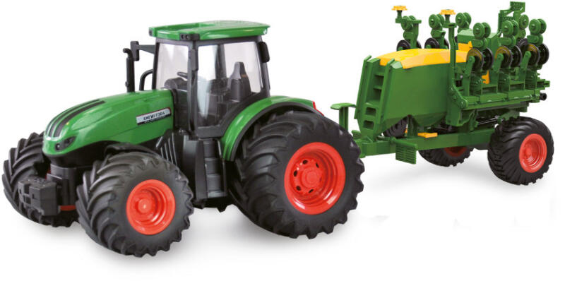 Egy nagyon szépen kidolgozott RC traktor modell távirányítós vetőkocsival. A modell dizájnja igazán gyönyörű, a modell előnyei közé tartoznak a nagy, széles kerekek, az első lámpák és a motor hangja. További előnye a lassú vezetés, amely erővé alakul, ahogy egy traktornak lennie kell! A tisztességes akkumulátor-üzemidő akár 35 perces vezetést is lehetővé tesz. A traktor akkumulátora cserélhető. A modellvezérlőnek nincs antennája vagy karja, ami azért jó, mert a gyerekeknek nincs mit eltörniük. A traktor világít és valósághű hangokat ad ki, előre, hátra, balra, jobbra halad. Nagy hátsó kerekek hajtják, amelyek mély mintázatú puha gumiabroncsokkal vannak felszerelve.