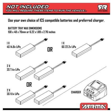 Átlagos használatra egy LiPo akkumulátor Spektrum 14.8 V 5000 mAh Smart technológiával, vagy Spektrum G2 14.8 V 5000 mAh Smart G2 technológiával. A lassabb sebesség miatt ez a megoldás alkalmas gyermekek számára.