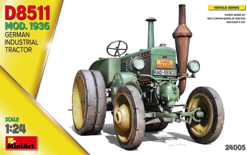 A D8511 MOD. 1936 német ipari traktor 1/35 méretarányú modell változata. Jellemzők:- 1:35 méretarány - Műanyag - Aprólékos kidolgozás - Festést, ragasztást igényel - 3 féle matrica jelölés opció
