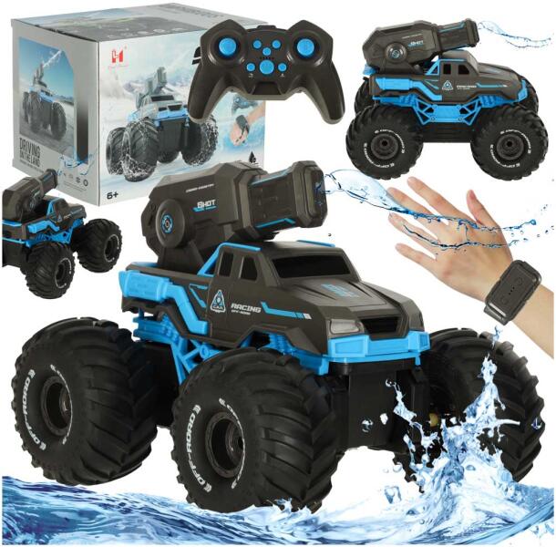 Műszaki adatok:Anyag: műanyag, gumi Szín: fekete és kék Életkor: 6+ Autó tápellátása: 500 mAh 7,4 V akkumulátor (tartozék) Hagyományos vezérlő áramellátása: 2x AA elem (nem tartozék) Karkötős vezérlő tápegység: AAA elem (nem tartozék): 2x AAA elem (nem tartozék) Autó méretei: 24 cm x 19 cm x 18 cmGumik átmérője: 9 cm Vezérlő méretei: 13,5 cm x 9 cm x 4,5 cm Csomag méretei: 24,5 cm x 19 cm x 19,5 cm Készlet tartalma:RC autó Kézi vezérlő Vezérlő Tároló Töltőkábel Csavarhúzó