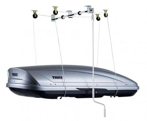 A Thule 572-es box lifttel helytakarékosan lehet tárolni a tetőboxot, kajakot, kenut, szörfdeszkát, sílécet.