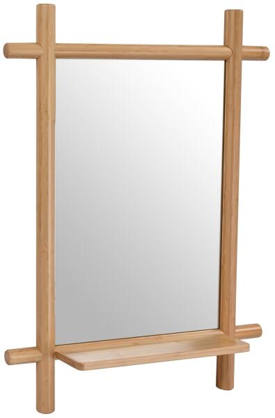 A 55x74 cm méretű fali tükör természetes színű tömör bambuszból készült, amely kellemes és meleg hangulatot kölcsönöz a helyiségnek. A tükörfelület kiváló minőségű üvegből készült, tiszta tükröződéssel, ideális mindennapi használatra. A tükörhez tartozik egy praktikus bambusz polc, amely apró tárgyak tárolására alkalmas, és növeli a tükör funkcionalitását. A látható kerek bambusz elemekkel ellátott kialakítás természetes és egyben modern hatást kelt, így könnyen beilleszthető különböző belső terekbe. A tükör a falra rögzíthető, így helyet takarít meg, és egyben dekoratív és praktikus funkciót is betölt.
