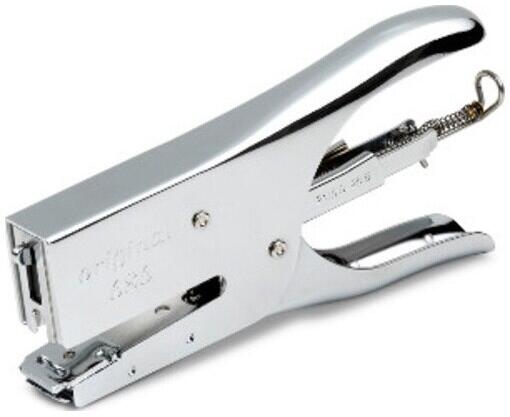 Kézi tűzőgép (fogó típusú) eredeti Turikan 686, 35-40 lapos, kapcsok 24/6, 24/8, 26/6, króm Jellemzők: Fogó fém tűzőgép, könnyű és kényelmes használat; Tűzés típusa: zárt / nyitott; Használt kapcsok: 24/6, 24/8 és 26/6; Tűzési mélység: 55mm; Rakodóképesség: 150 tűzőkapocs; Tűzési kapacitás: 35-40 lap; Súly: 360 g; Szín: ezüst króm.
