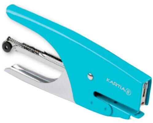 Kézi tűzőgép (fogó típusú) TURIKAN Kartia 8, 20 lap, 6/4 tűző, kék Jellemzők: Kézi tűzőgép, fogó típusú 6/4-es Kartia8 kapcsokkal; Acél test; Ergonomikus fogantyú a szilárdabb fogásért, könnyed tűzésért; Átlátszó pvc buborékfóliába csomagolva; Tűzés típusa: zárt; Tűzési mélység: 46 mm; Rakodóképesség: 200 tűzőkapocs; Tűzési kapacitás: 5 - 20 lap; Súly: 208 g; Szín: kék.