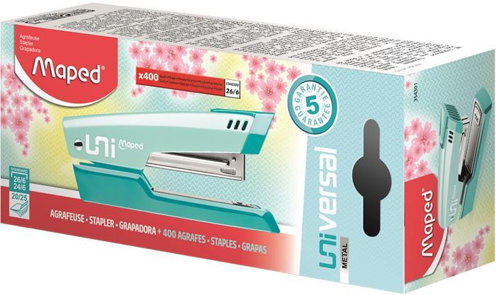 Tűzőgép, 24/6, 26/6, 25 lap, MAPED "Universal Metal Half-Strip Pastel", pasztell türkiz - IMA354301 - 24/6-os tűzőgépek 30 lapig - Tűzőgép pasztell türkiz színben. - fém test