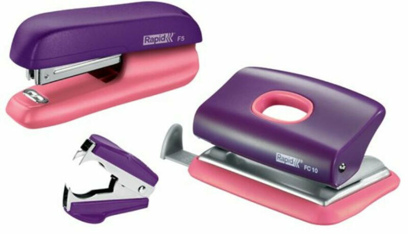 Tűzőgép, lyukasztó és kapocskiszedő szett, 10 lap, RAPID F5 Mini, lila/barack (E5000372)